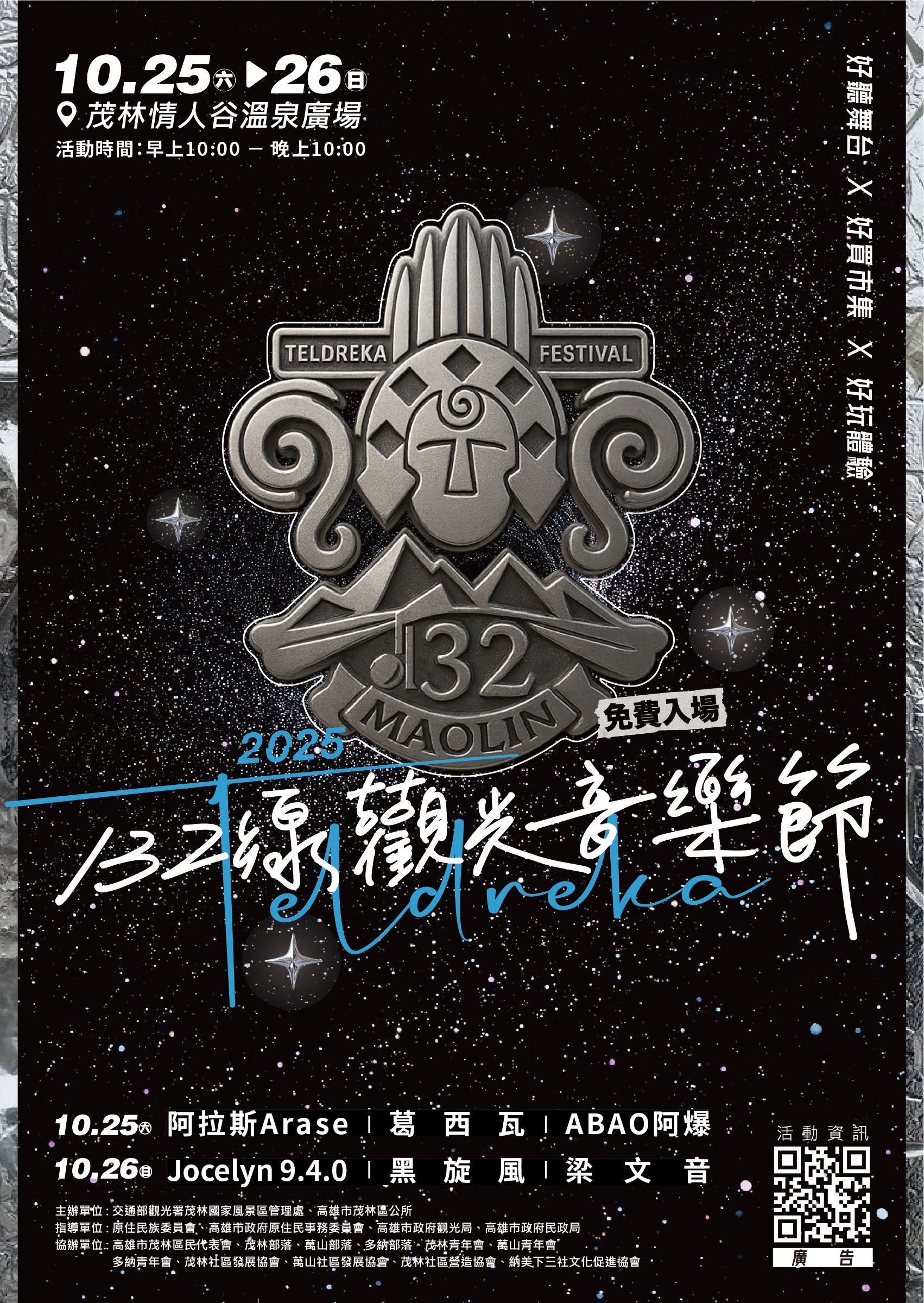 協助宣傳「Teldreka 132線觀光音樂節」活動 一、本活動訂於114年10月25日(六)至26日(日)上午10時至下午10時於茂林情人谷溫泉廣場辦理,內容有市集活動、舞台演出、手作體驗、文化策展及遊程活動等。二、相關訊息將持續公告於本所官方臉書粉絲專頁(https://reurl.cc/9n8x5d),活動內容豐富多元,敬邀貴單位協助公告周知,鼓勵所屬及民眾踴躍參與。 Attachments: FileFile size 63657669_11431227400A0C_ATTCH2 (1).jpg2619 kB Teldreka 132線觀光音樂節.pdf358 kB