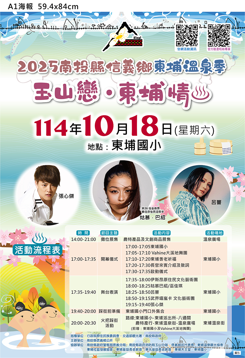 協助宣傳「2025年信義鄉東埔溫泉季活動」 一、活動日期:114年10月18日(星期六)二、活動時間:下午2時00分至下午8時30分三、活動地點:本鄉東埔國小(南投縣信義鄉開高巷63號)四、聯絡方式:本所農業觀光課陳技士049-2791515#160 Attachments: FileFile size 2025年信義鄉東埔溫泉季活動.jpg901 kB 2025年信義鄉東埔溫泉季活動.pdf305 kB