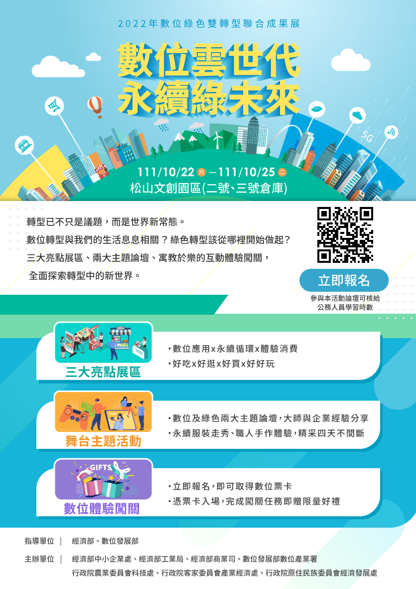 轉知經濟部中小企業處與數位發展部於111年10月22日(星期六)至10月25日(星期二)假松山文創園區舉辦「2022年數位綠色雙轉型聯合成果展」EDM1份,歡迎踴躍宣傳週知。 依據經濟部中小企業處111年10月11日中企資字第11108003250號函辦理。 Attachments: FileFile size 附件1331 kB 附件2351 kB 來文函示193 kB