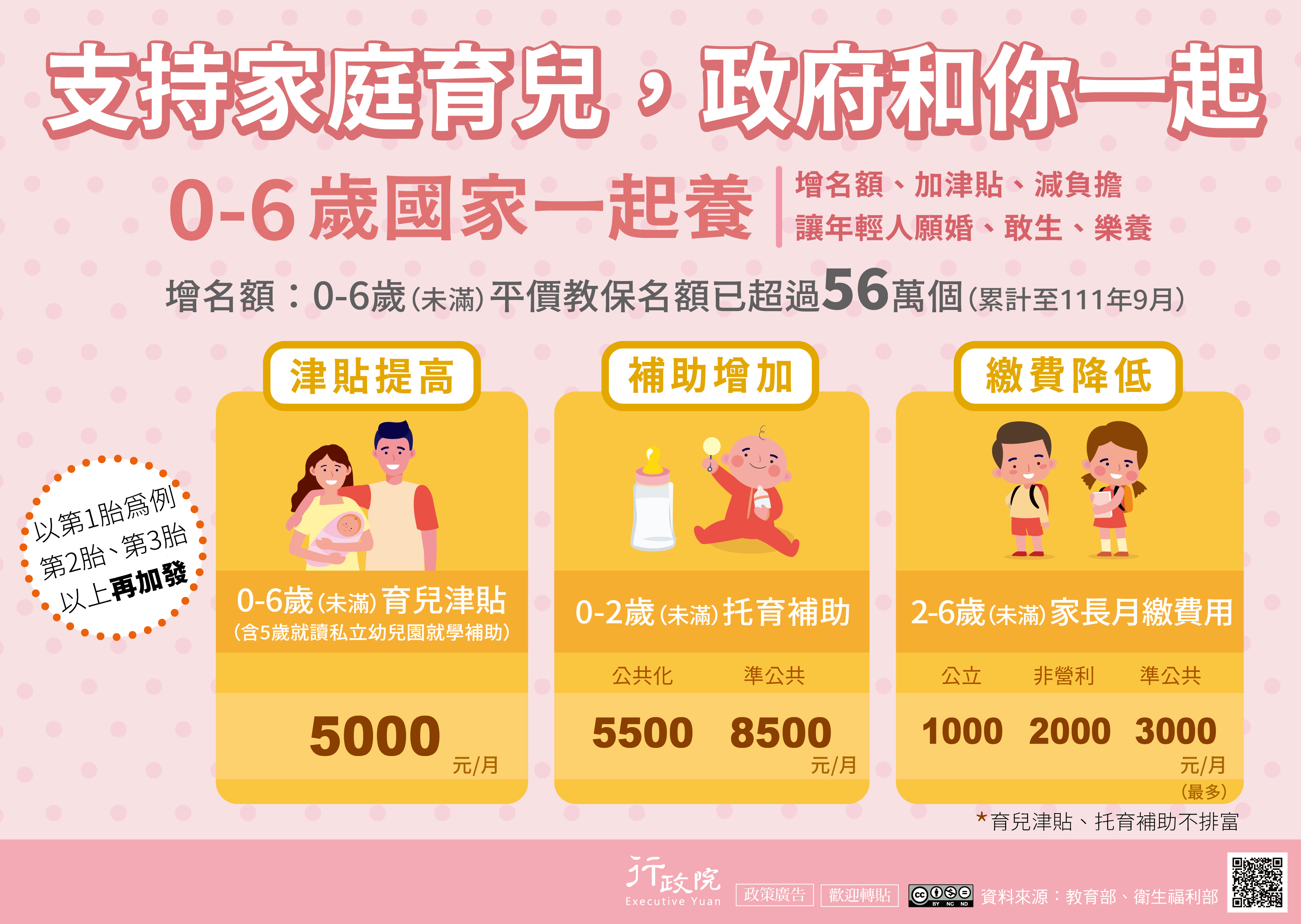 轉知行政院新聞傳播處推廣「0-6歲國家一起養」政策說明資料事,歡迎踴躍宣傳週知。 一、 依據行政院新聞傳播處111年11月23日院臺聞字第1110194609號函辦理。 二、 為提供養兒育女家庭最大的奧援,讓年輕人敢婚、願生、樂養,政府於明(112)年起擴大推動以增名額、加津貼、減負擔為主軸的「0-6歲國家一起養」政策(2021-2024),期以傾全國之力協助培養國家未來的棟梁,請協助推廣旨揭資料,電子檔請自行下載運用。 三、 檢附原函及附件各1份供參。 Attachments: FileFile size 附件1210 kB 附件22124 kB 來文函示206 kB