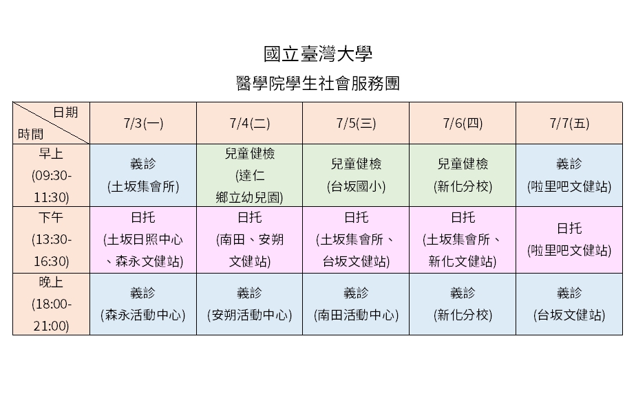 國立臺灣大學學生社團「醫學院學生社會服務團」,訂於112年暑假將組隊前往本鄉為當地原住民部落進行義診及醫療服務活動,請查照。 日期及活動規劃附圖,請有需要的民眾多多利用。 Attachments: FileFile size 國立臺灣大學112年5月16日校學字第1120040481號函.pdf281 kB