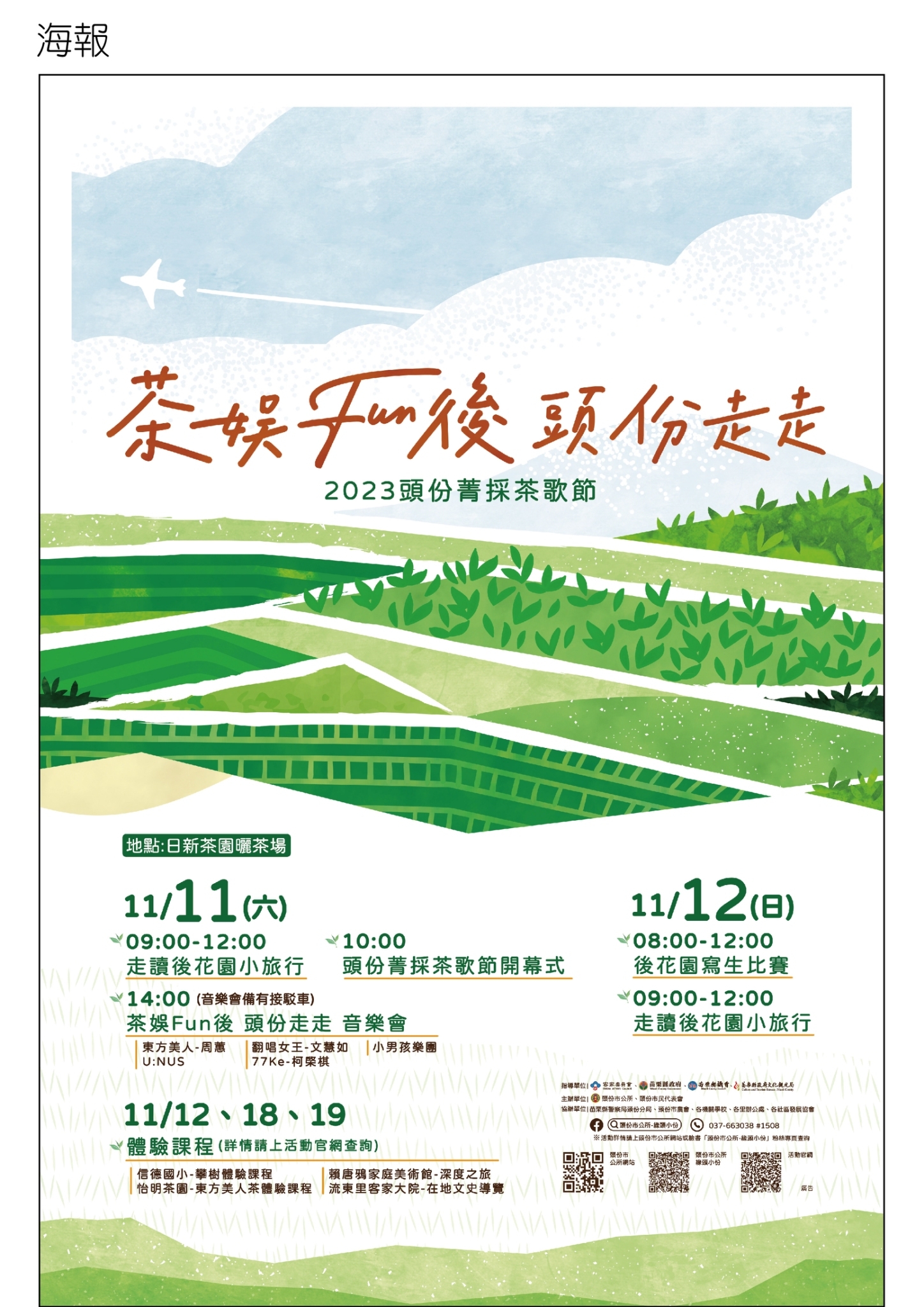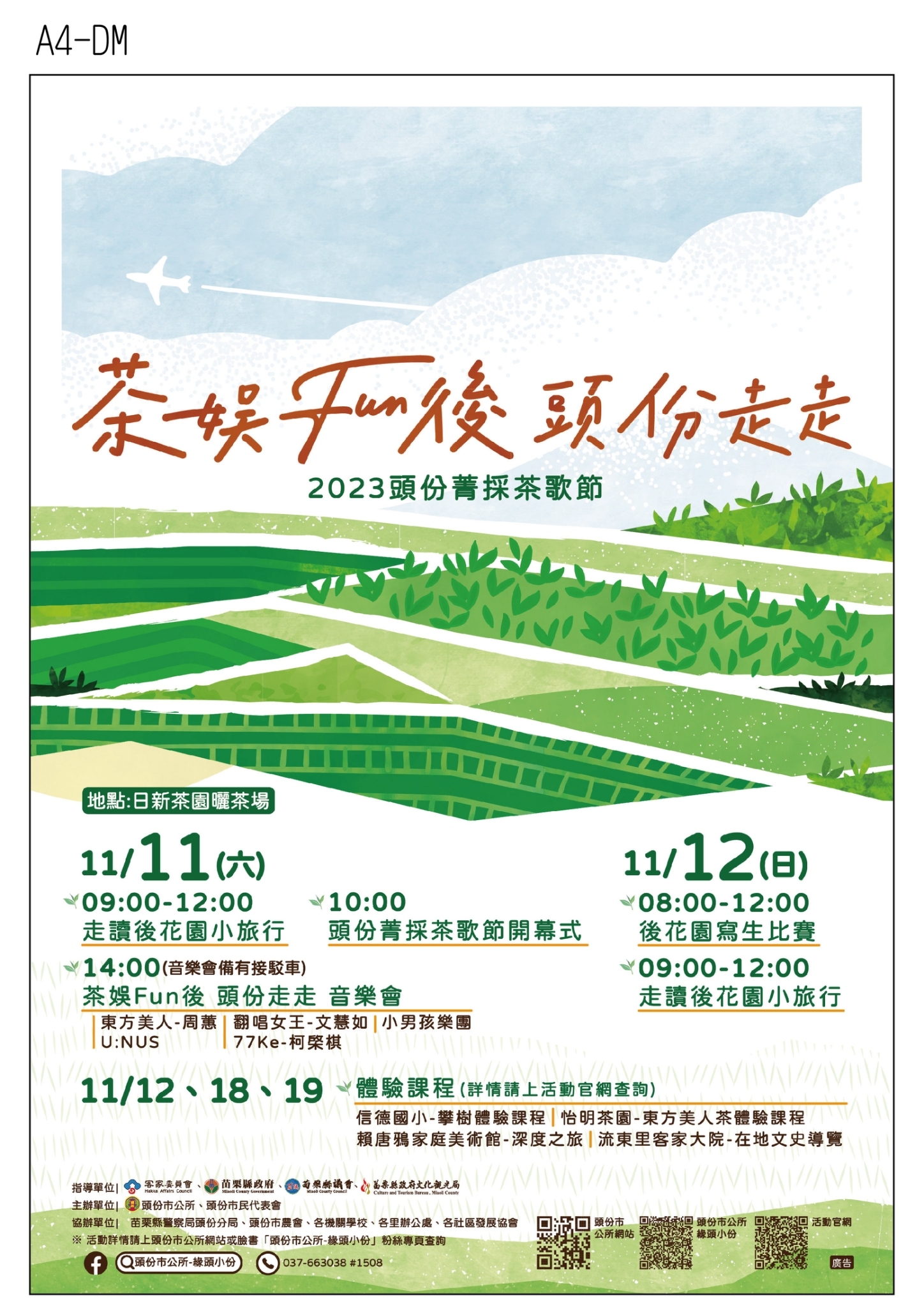 轉知苗栗縣頭份市公所於112年11月11日至19日連續兩周末辦理「2023菁採茶歌節活動」 轉知苗栗縣頭份市公所於112年11月11日至19日連續兩周末辦理「2023菁採茶歌節活動」,歡迎民眾宣傳周知並鼓勵所屬同仁及民眾踴躍參加。 Attachments: FileFile size 0048060_LINE_ALBUM_文宣校稿-2_231006_8.jpg1380 kB 0048060_LINE_ALBUM_文宣校稿-2_231006_9.jpg1273 kB 0048060_qrcode.png5 kB 112P012364_1120048060_att_print.pdf206 kB