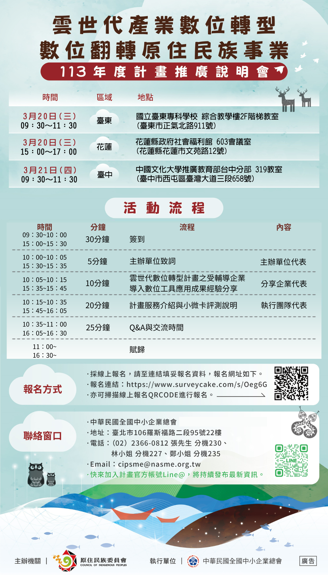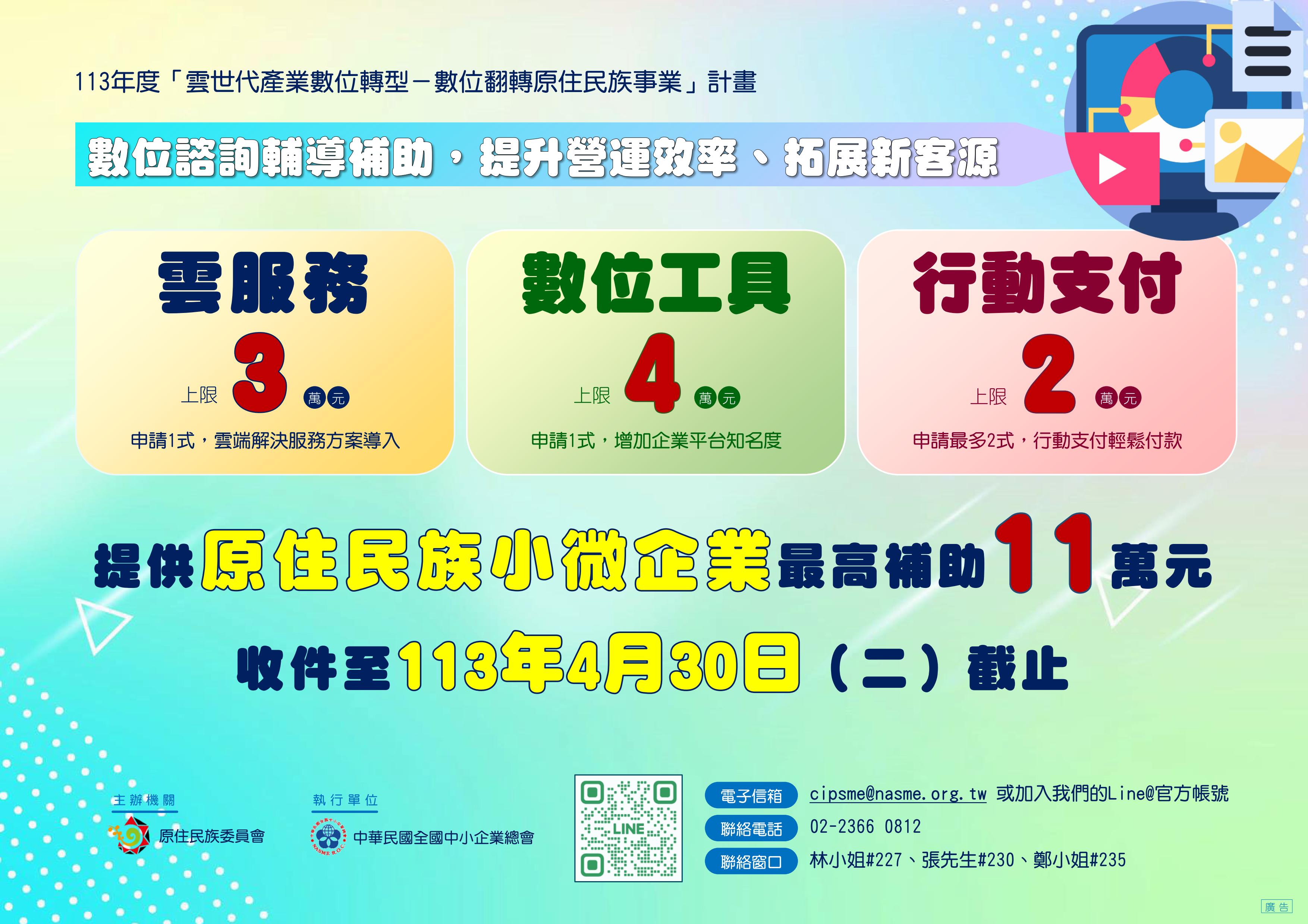 轉知原住民族委員會113年度「雲世代產業數位轉型-數位翻轉原住民族事業」說明會 轉知原住民族委員會113年度「雲世代產業數位轉型-數位翻轉原住民族事業」說明會簡章、EDM、懶人包各1份,歡迎民眾宣傳週知並鼓勵所轄原住民族企業、單位踴躍參與,請查照。 Attachments: FileFile size 113K00P001427_1130010642_113D2004450-01.jpg1786 kB 113K00P001427_1130010642_113D2004451-01.jpg614 kB 113K00P001427_1130010642_113D2004452-01.pdf275 kB 113K00P001427_1130010642_att_print.pdf303 kB