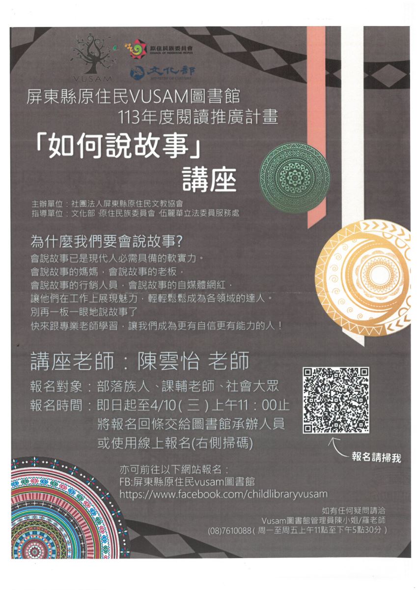 轉知屏東縣原住民文教協會辦理「113年度閱讀推廣計畫-如何說故事」活動講座