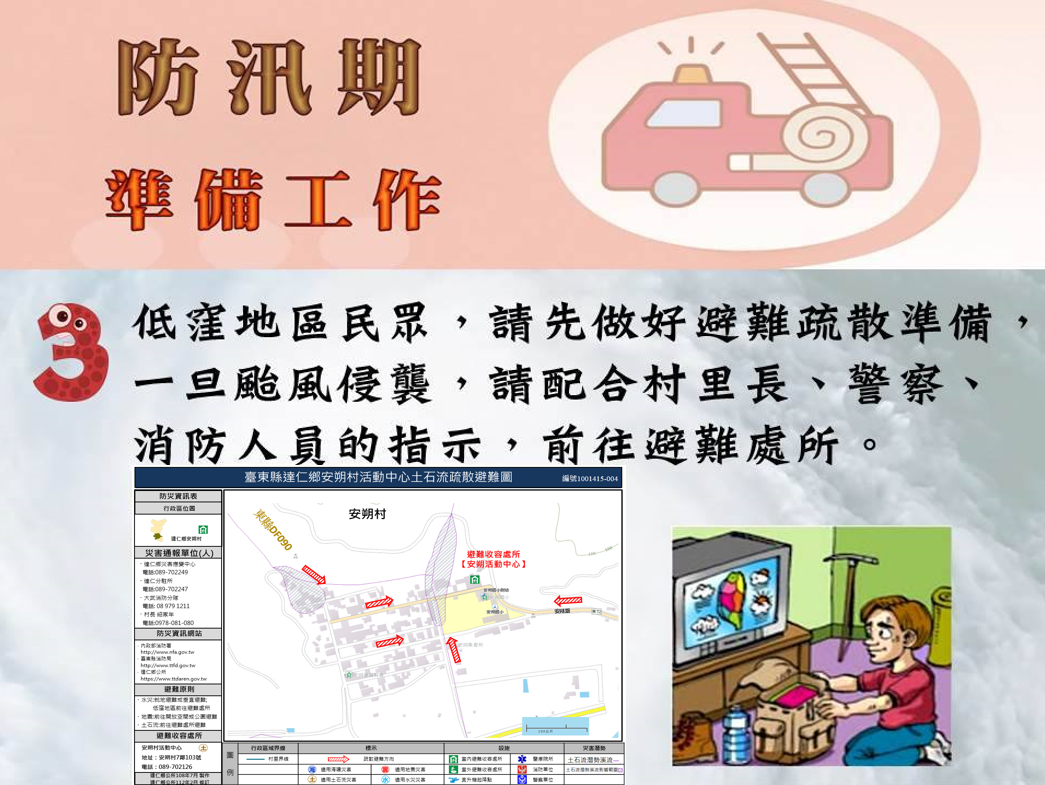 113年度達仁鄉公所疏散撤離應變作為宣導 汛期將屆,請居住於災害潛勢區或易致災潛勢區民眾多加注意,如大雨不斷,研判可能發生土石流或坡地崩塌等災害,敬請該區民眾做好避難準備,隨時收聽避難、撤離之訊息,並聽從公部門指示配合疏散撤離作為。 如有相關疑問及建議,請電洽災害防救承辦-林灝,(089)702249#316。 臺東縣達仁鄉公所關心您