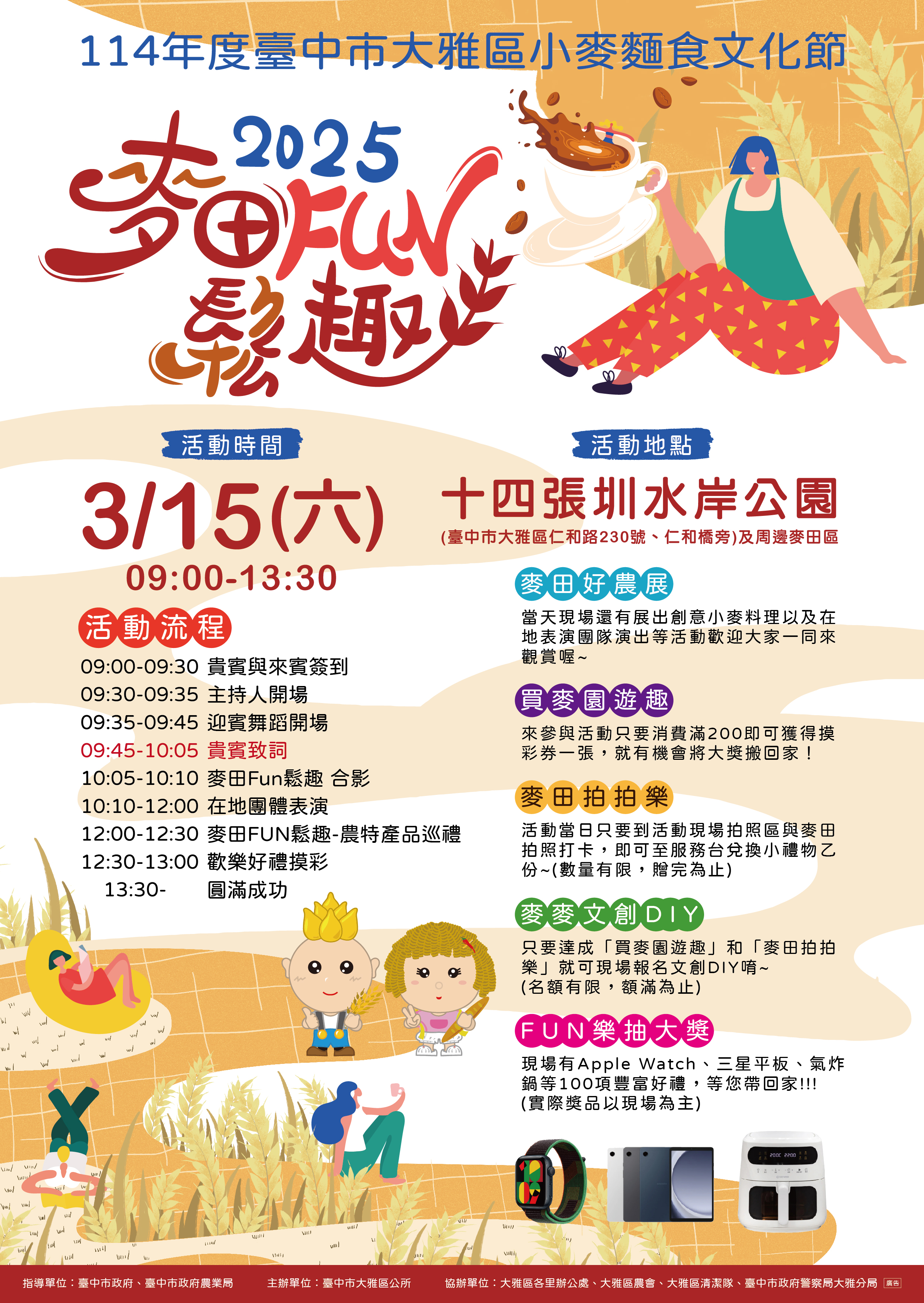「114年度臺中市大雅區小麥麵食文化節」活動活動時間:114年3月15日(星期六)上午9時至下午1時30分 一、活動時間:114年3月15日(星期六)上午9時至下午1時30分。 二、 活動地點:大雅區十四張圳水岸公園(臺中市大雅區仁和路230號、仁和橋旁)及周邊麥田區。 三、 活動內容:麥田好農展、買麥園遊趣、麥田拍拍樂、麥麥文 創DIY、FUN樂抽大獎及在地團體表演活動。(詳如活動海報)。 Attachments: FileFile size 小麥文化節公文.pdf208 kB 小麥文化節海報.jpg4005 kB