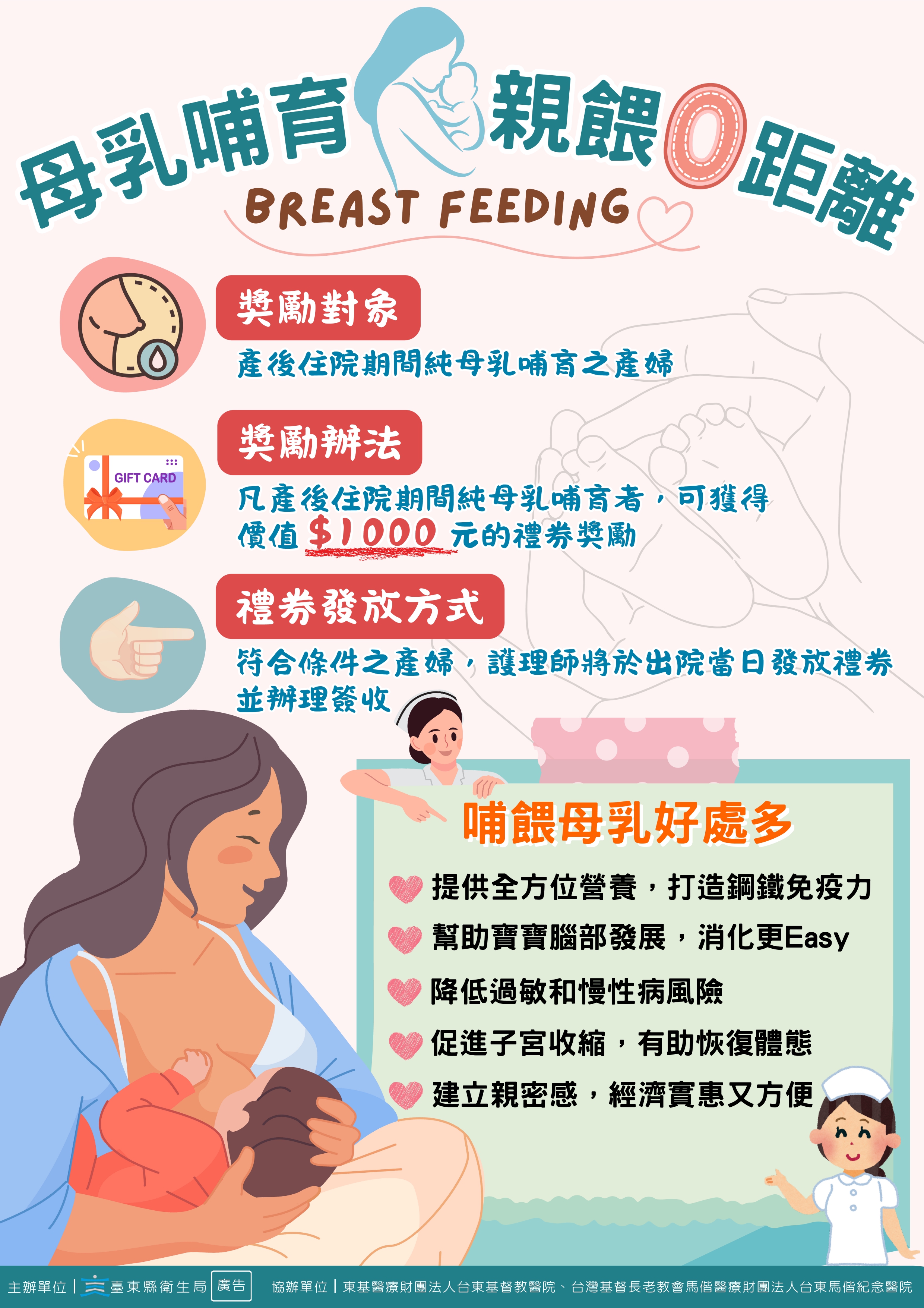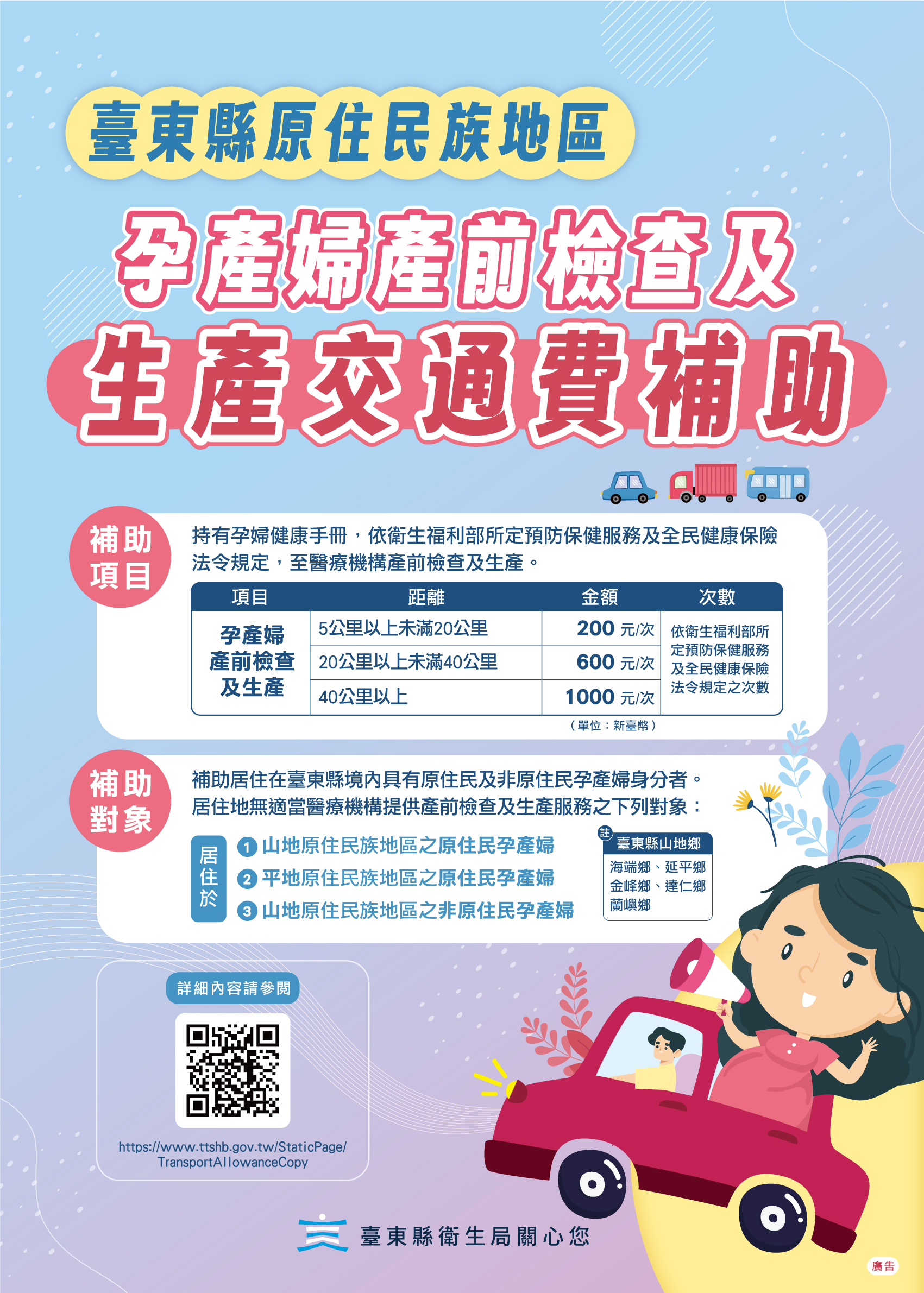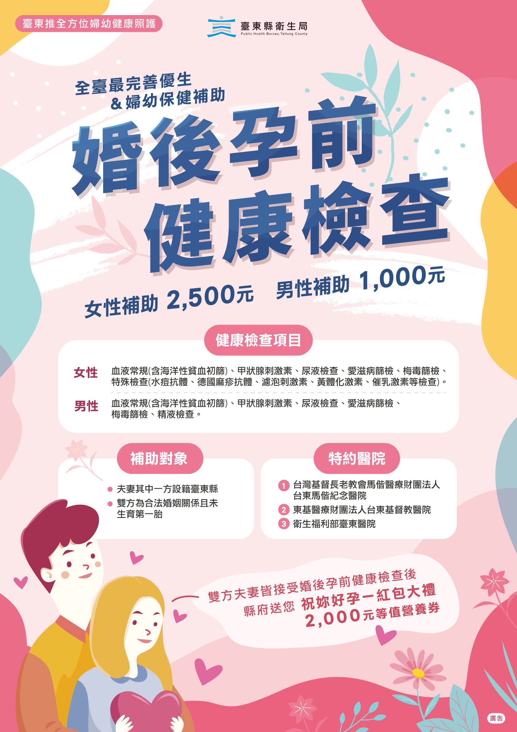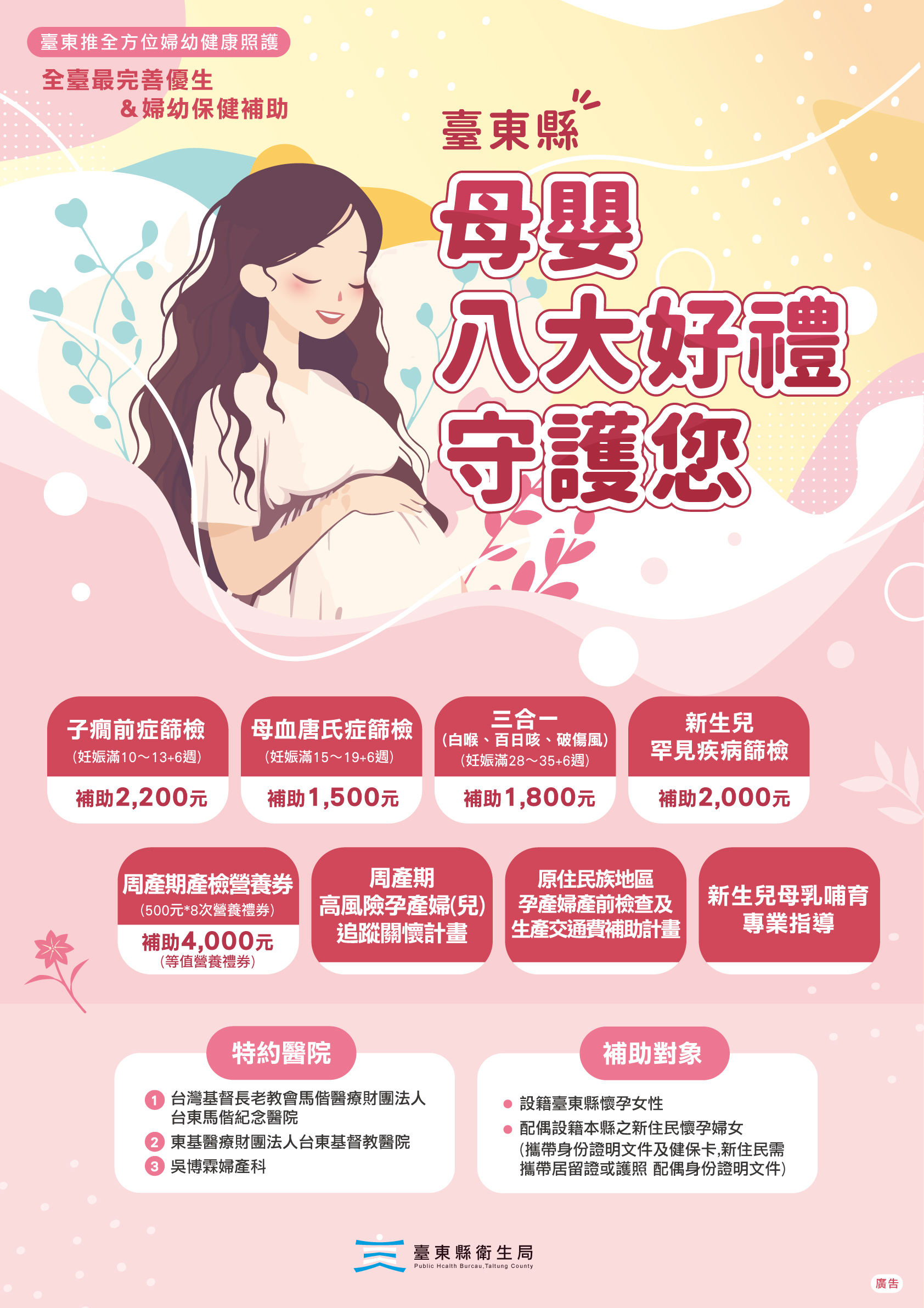 轉知臺東縣衛生局婦幼全方位照護方案 Attachments: FileFile size 台東縣母嬰八大好禮守護您文宣.jpg1395 kB 臺東縣原住民族地區孕產婦產前檢查及生產交通費補助文宣.jpg1893 kB 臺東縣婚後孕前健康檢查文宣.jpg1280 kB 臺東縣母乳哺育親餵0距離文宣.jpg2521 kB