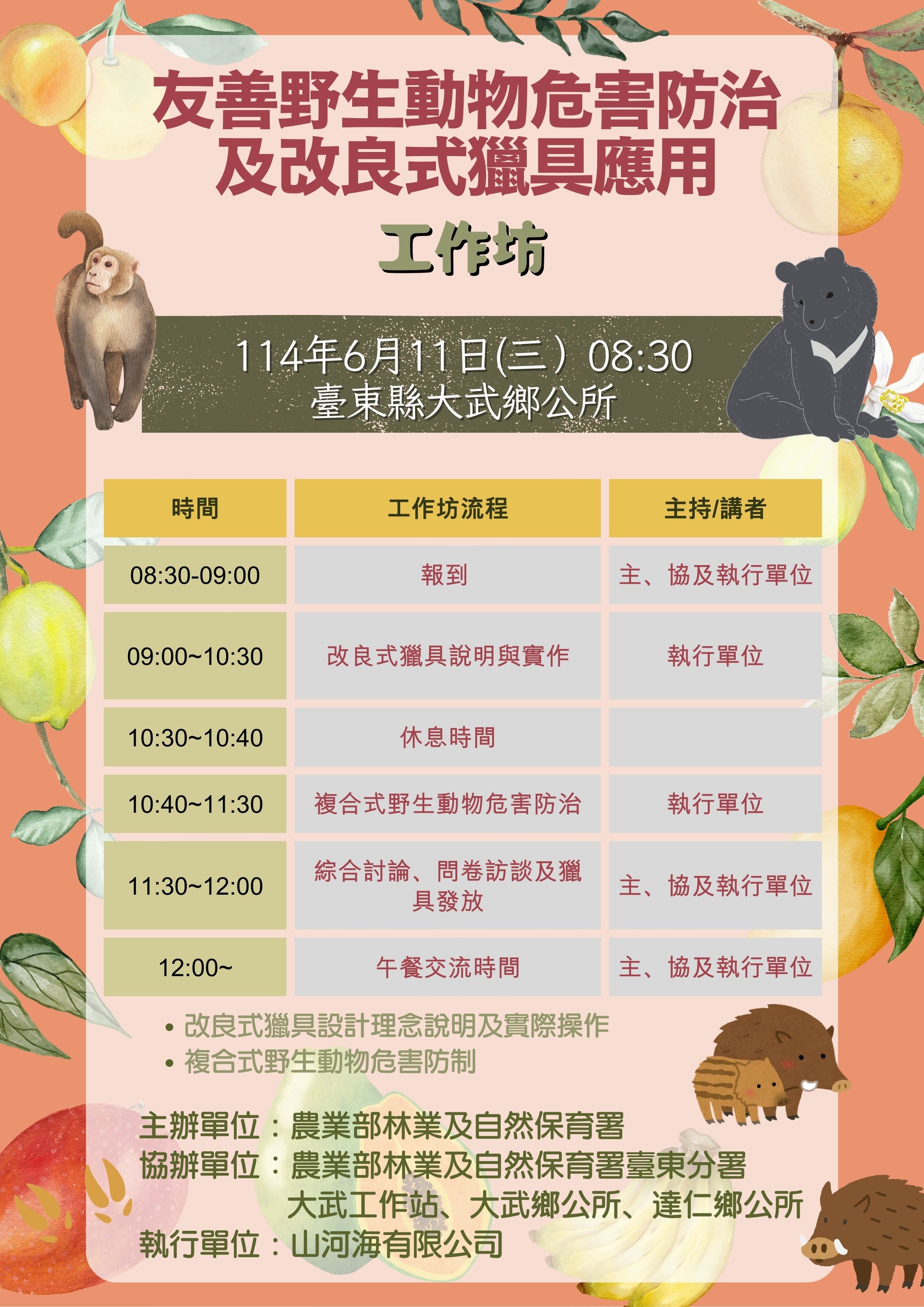 有關林保署辦理「友善野生動物危害防治方法與改良式獵具應用工作坊」 Attachments: FileFile size 友善野生動物危害防治方法與改良式獵具應用工作坊(公文).pdf324 kB 友善野生動物危害防治方法與改良式獵具應用工作坊(海報).jpg757 kB 友善野生動物危害防治方法與改良式獵具應用工作坊(附件).pdf80 kB