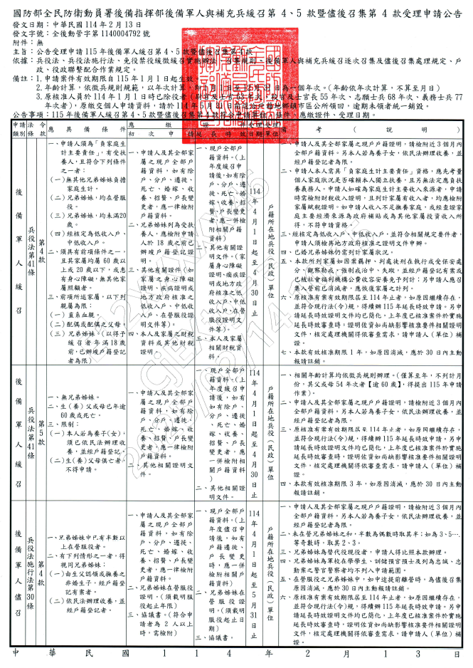 114年後備軍人及補充兵緩召及儘後召集申請公告