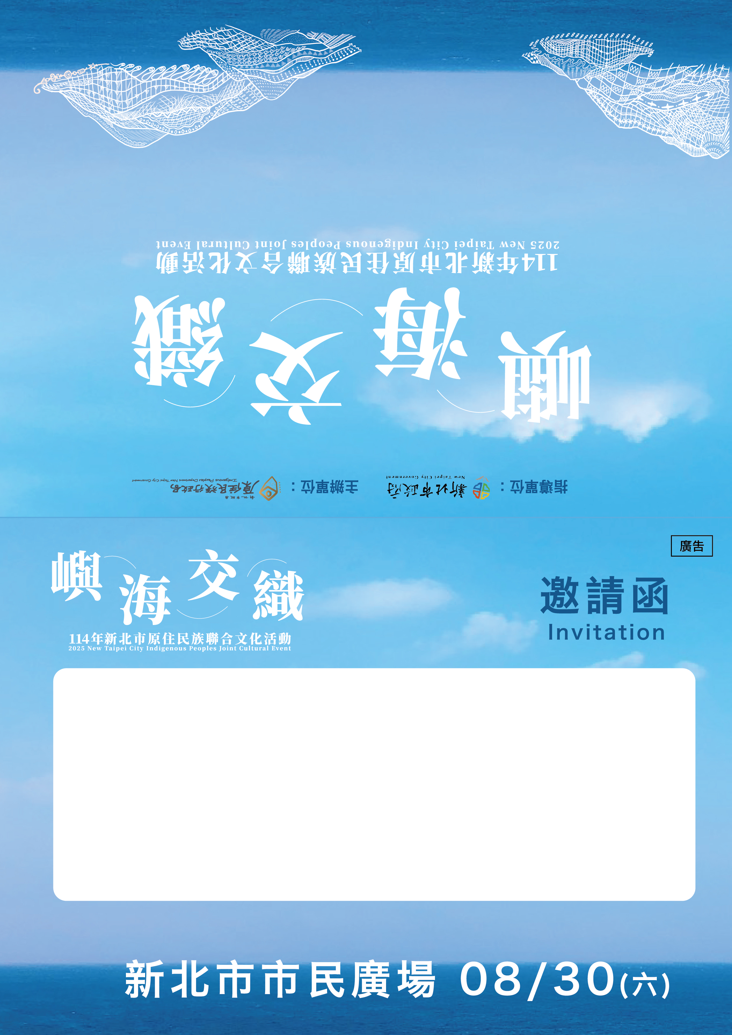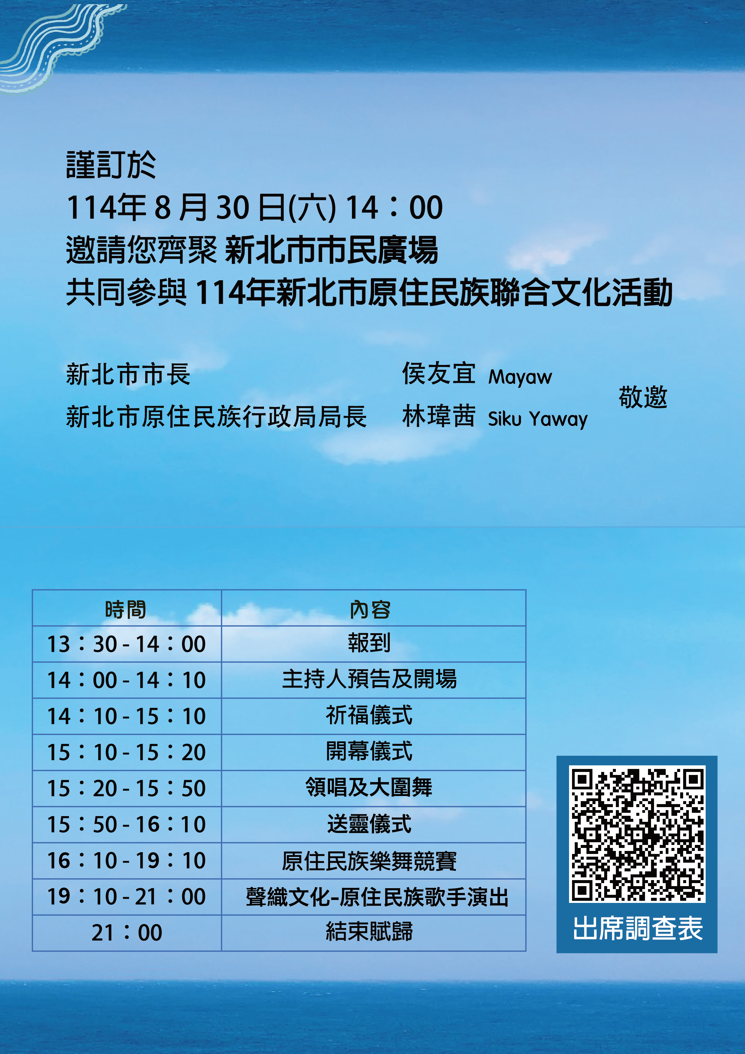 轉知新北市原民局辦理「114年原住民族聯合文化活動─嶼海交織」活動資訊 新北市政府原住民族行政局辦理「114年原住民族聯合文化活動-嶼海交織」惠請踴躍參加。 一、活動日期、時間及地點:114年8月30日(星期六),下午2時至下午9時,假新北市市民廣場。 二、活動流程: (一)主舞台: 1、祈福儀式:下午2時10分至下午4時10分。 2、樂舞競賽:下午4時10分至下午7時10分。 3、聲織文化:下午7時10分至下午21時10分。 (二)副舞台:原青論壇,下午7時10分至下午21時10分。 三、檢附邀請卡電子檔1份。 Attachments: FileFile size 邀請卡封面2761 kB 邀請卡內面2894 kB