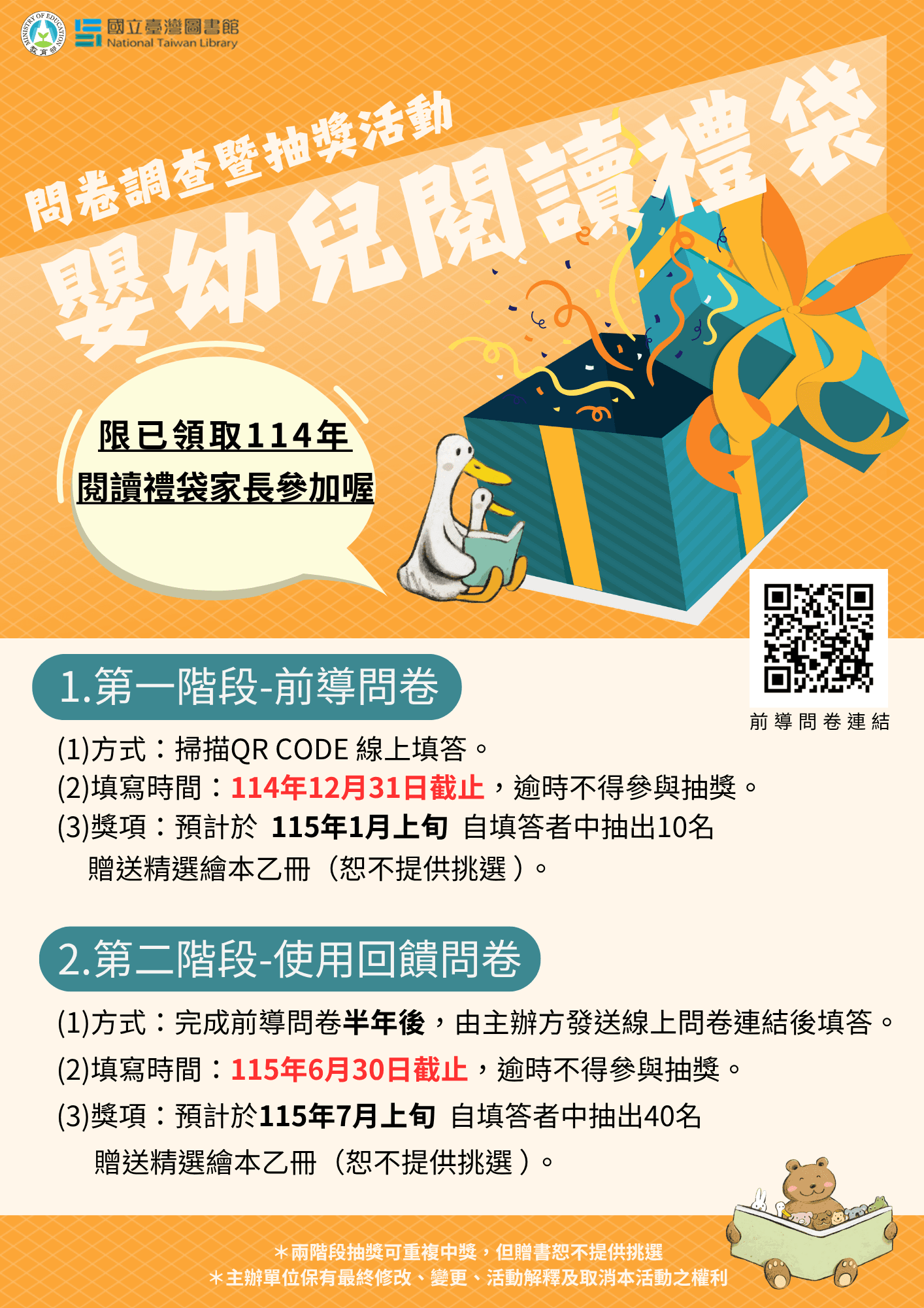 一、依教育部114年1月14日臺教社(四)字第1142400082號函及國立臺灣圖書館114年7月30日圖推字第11401002170號函辦理。 二、旨揭問卷為瞭解家長獲知教育部閱讀禮袋資訊之管道、利用閱讀禮袋及圖書館嬰幼兒閱讀資源情形,以及親子共讀現況等,以領有114年閱讀禮袋之家長為對象進行調查,說明如下: (一)問卷採線上表單形式,限領有114年閱讀禮袋者填答,並分為前導問卷及使用回饋問卷: 1、前導問卷(已領取閱讀禮袋,尚未使用者填答):即日起至本(114)年12月31日止(逾時不得參與抽獎),由各直轄市、縣市公共圖書館協助引導家長填寫,連結如下:https://forms.gle /HKNPh9wvp9jLPxa59。 2、使用回饋問卷(使用閱讀禮袋後填答):民眾自填寫前導問卷半年後,由本館依據填答者提供之電子郵件寄送使用回饋問卷線上表單連結。填答至115年6月30日止。 (二)抽獎:為鼓勵民眾填寫問卷,本館將分二階段抽獎,第 一階段預計於115年1月上旬,自前導問卷填答者中抽出10名贈送精選繪本1冊;第二階段預計於115年7月上旬, 自使用回饋問卷填答者中抽出40名贈送精選繪本1冊。相關資訊請參考教育部嬰幼兒閱讀推廣計畫網站 (https://www.pccr.tw/)最新公告。 三、請貴館協助於官網或相關社群媒體平臺、流通櫃臺轉知相關訊息,並鼓勵民眾踴躍填寫,活動海報電子檔(含前導 問卷線上表單連結網址QR Code)如附件。