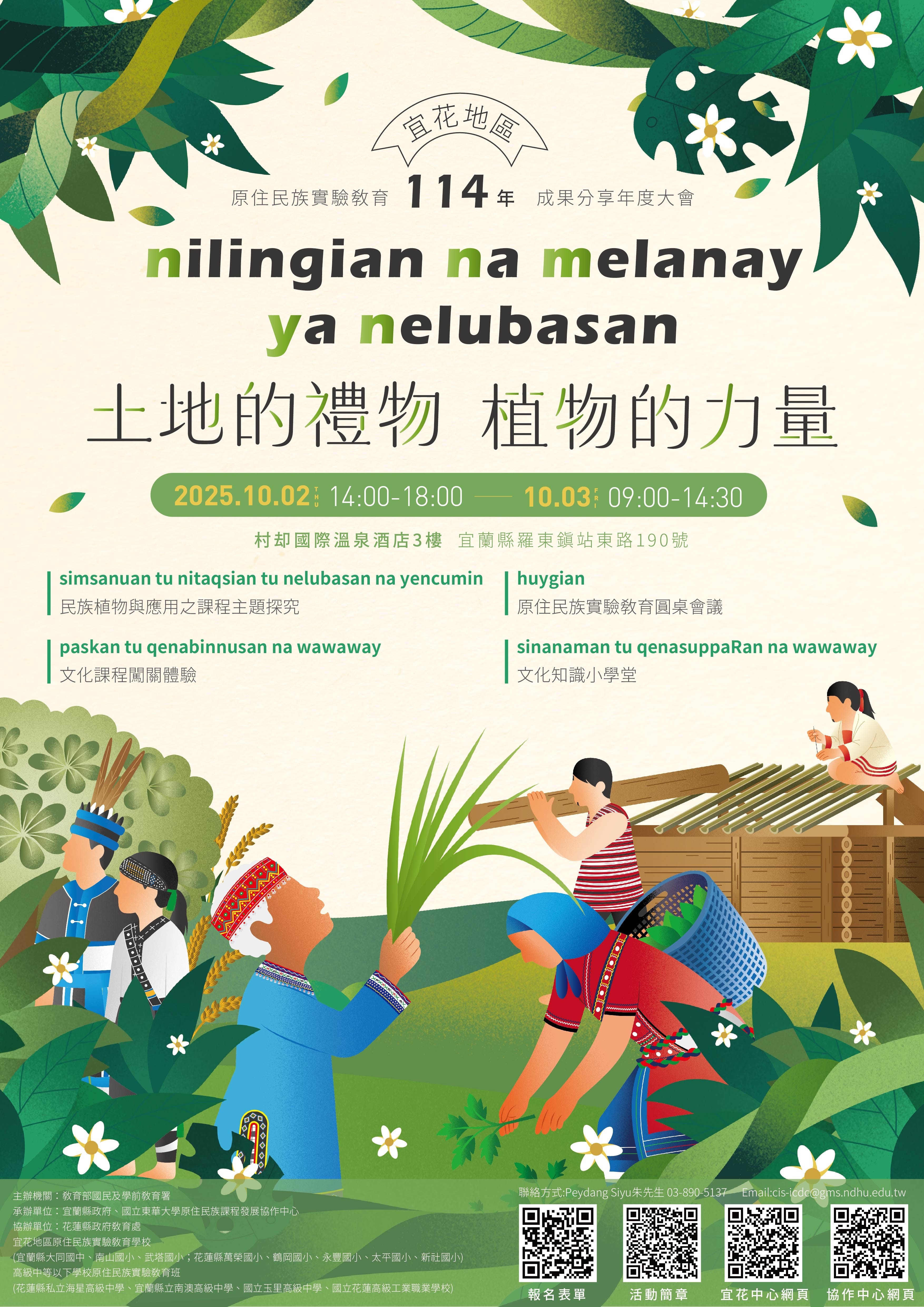【轉知】國立東華大學原住民族課程發展協作中心辦理 「nilingian na melanay ya nelubasan土地的禮物,植 物的力量─114年宜花地區原住民族實驗教育成果分享」 實施計畫書及活動海報