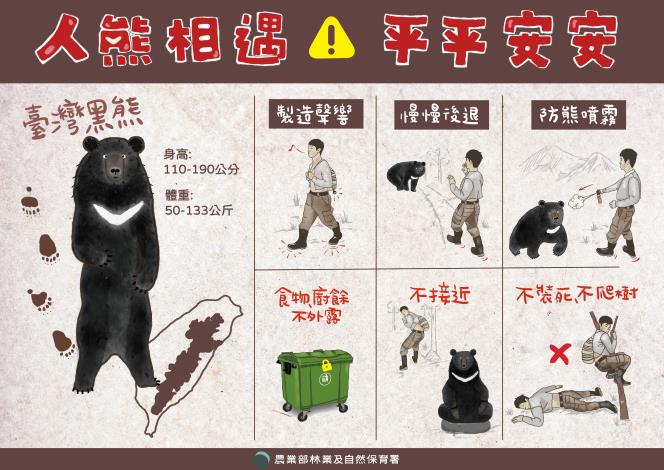 - 人熊相遇,三不口訣「不接近、不裝死、不爬樹」,製造聲響,慢慢後退,或上山時隨身攜帶防熊噴霧,減少人熊衝突。