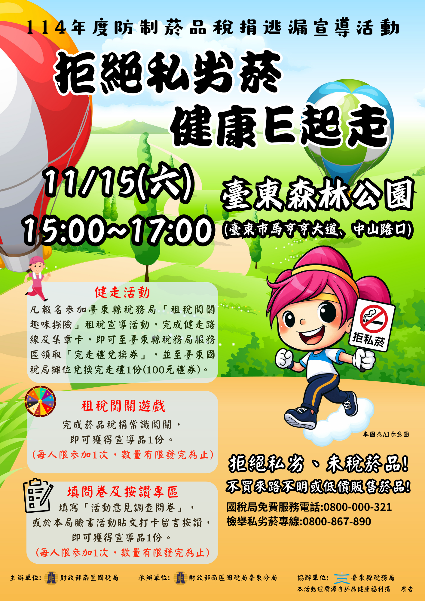 【協助宣導】財政部南區國稅局臺東分局辦理114年度防制菸品稅捐逃漏「拒絕私劣菸 健康e起走」 財政部南區國稅局臺東分局辦理114年度防制菸品稅捐逃漏「拒絕私劣菸 健康e起走」 活動訊息如下: 時間:114年11月15日(星期六)下午3時至5時。 地點:臺東森林公園(臺東市馬亨亨大道、中山路口)。 內容:當日於臺東森林公園除了舉辦健走活動外,現場設有「菸品稅捐遊戲闖關」、「填問卷專區」及「臉書打卡留言及按讚」等攤位,各備有限量好禮相送,詳情請參考活動海報。 Attachments: FileFile size 拒絕私劣菸健康E起走-活動海報.png1614 kB