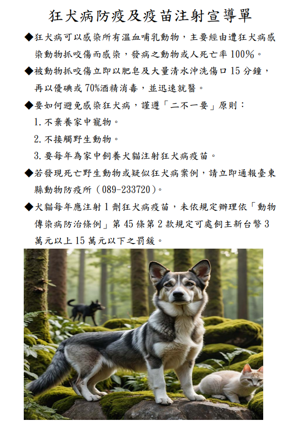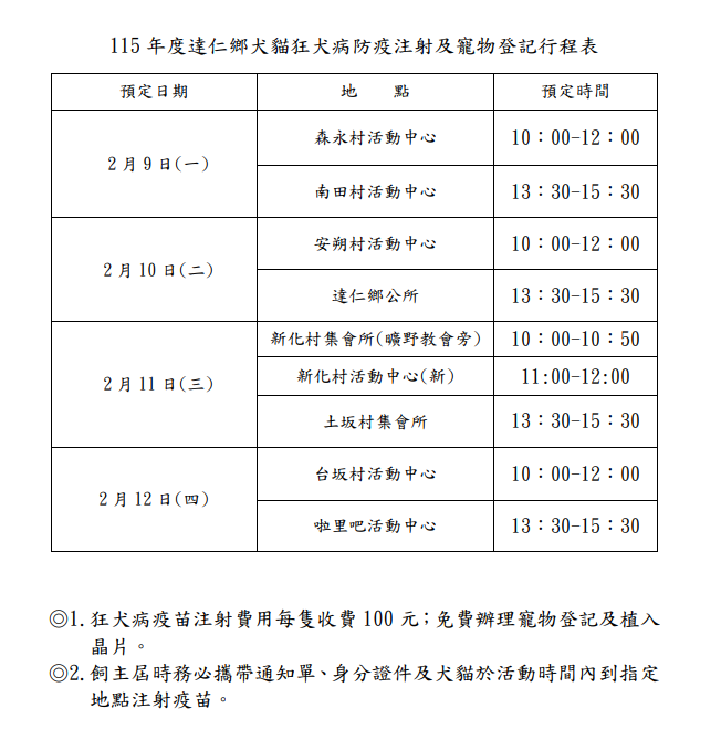 台東縣動物防疫所(115)年2月9日至12日派員至達仁鄉各村辦理狂犬病疫苗預防注射活動,各村注射行程表請點閱附件