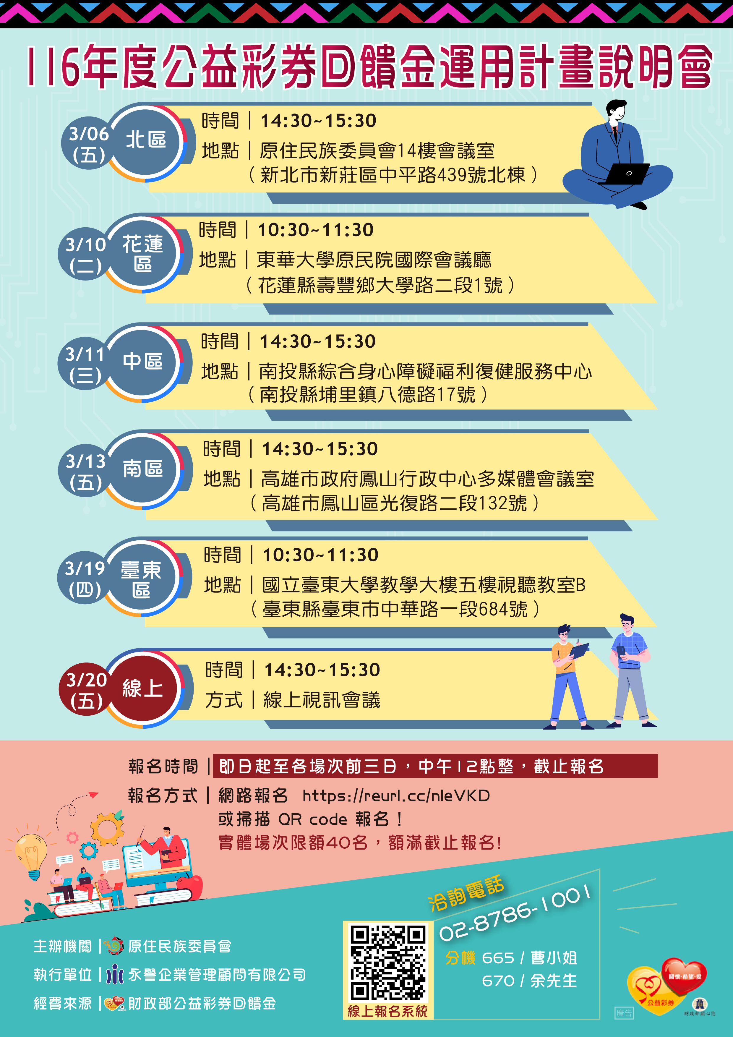 【轉知】原住民族委員會辦理「116年度公益彩券回饋金運用計畫說明會」,鼓勵民間團體踴躍報名參加