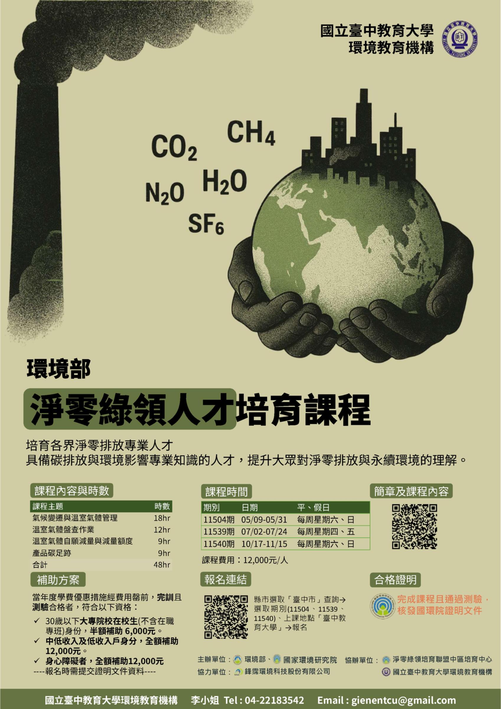 【轉知】國立臺中教育大學函送辦理115年度「環境部淨零綠領人才課程」資訊
